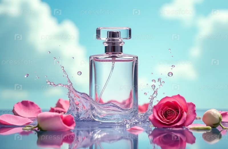 Макет прозрачной стеклянной упаковки для духов с лепестками роз в воде. Генеративный искусственный интеллект