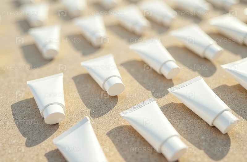 Макет белой тюбиковой бутылки косметической банки на песке пляжа. Генеративный искусственный интеллект