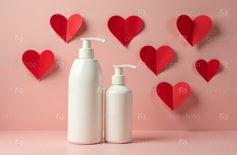 Макет Белая тюбик Бутылка Косметическая банка фон красные бумажные сердечки. Генеративный искусственный интеллект