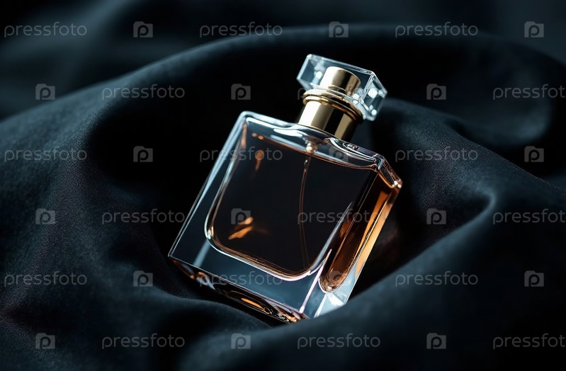 Макет прозрачной стеклянной упаковки для духов в черной ткани. Генеративный искусственный интеллект