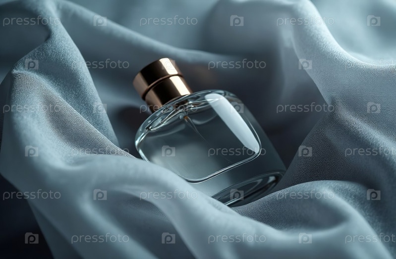 Макет прозрачной стеклянной упаковки для духов в серой ткани. Генеративный искусственный интеллект