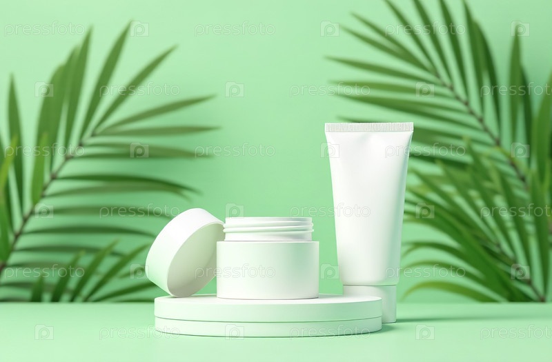 Макет белой тюбиковой бутылки косметической банки на фоне зеленых листьев. Генеративный искусственный интеллект