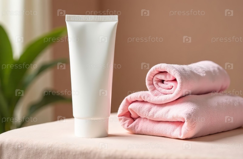 Макет белой тюбиковой бутылки косметической банки, спа-фон. Генеративный искусственный интеллект