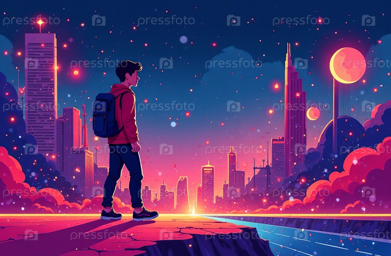 Человек на фоне Футуризм кибергород, панорама виртуальная реальность. Генеративный ИИ