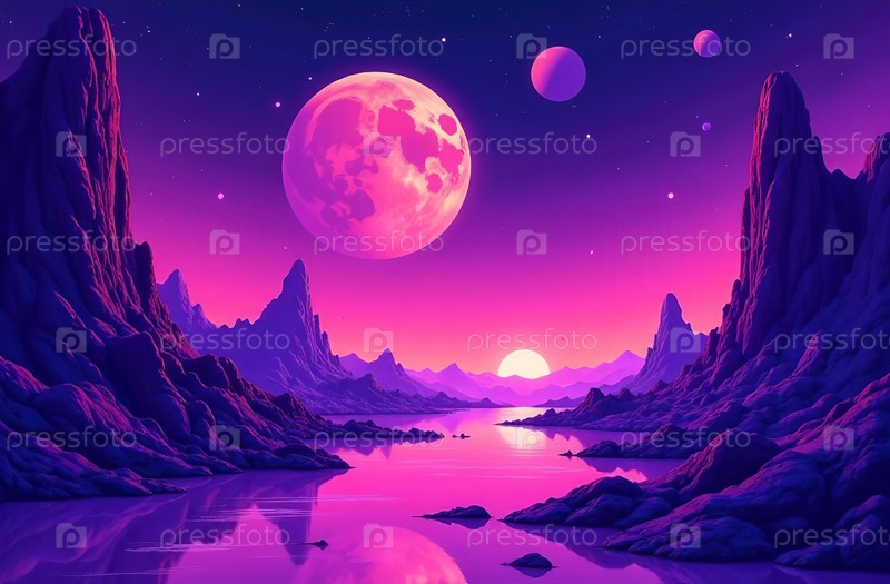 Ландшафт планета большой спутник ретро футуризм гора панорама. Генеративный ИИ