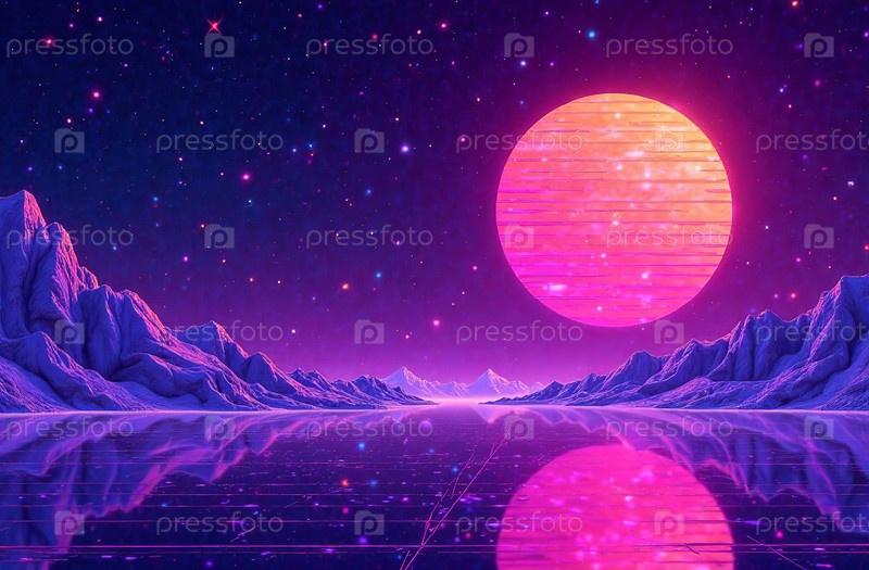 Ландшафт планета большой спутник ретро футуризм гора панорама. Генеративный ИИ