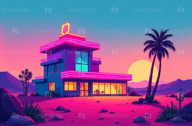 Ретро-футуризм, научная фантастика, городская панорама, здание, экстерьер. Генеративный искусственный интеллект