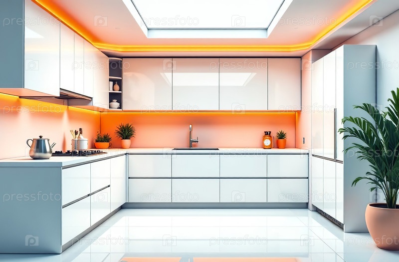 Ретрофутуристский интерьер здания, свободное пространство кухни. Генеративный искусственный интеллект