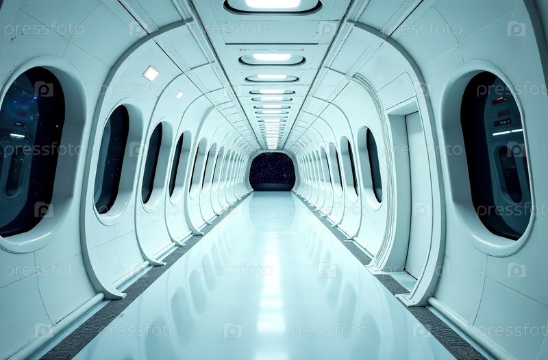 Интерьер космического корабля, космос и планеты в окне. Генеративный ИИ