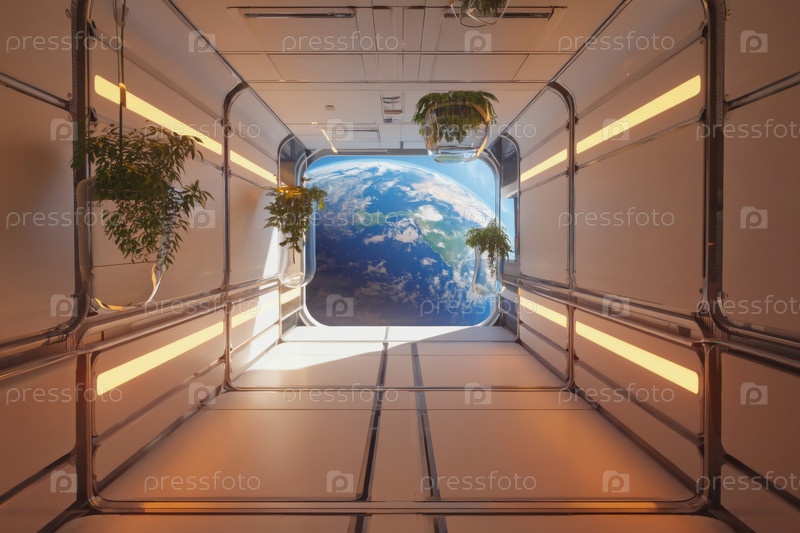 Интерьер космического корабля, космос и планеты в окне. Генеративный ИИ