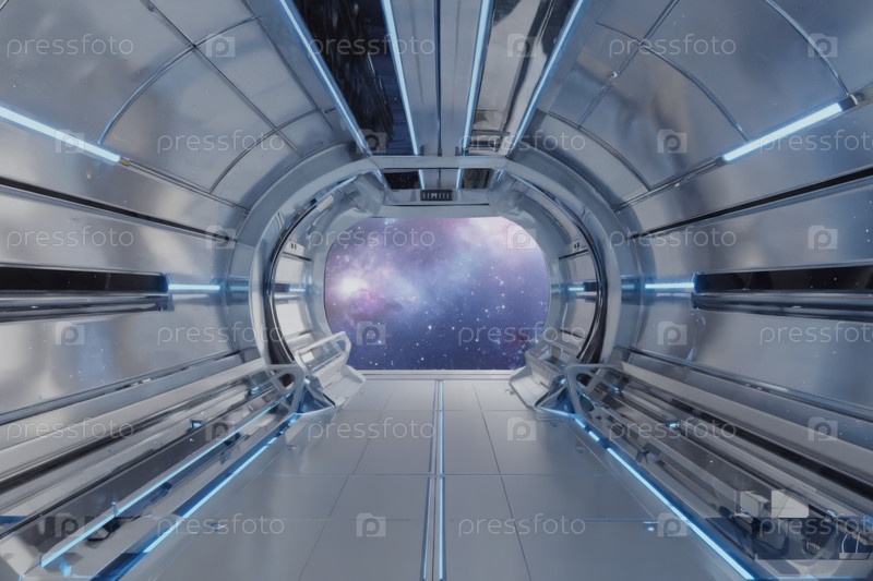 Интерьер космического корабля, космос и планеты в окне. Генеративный ИИ