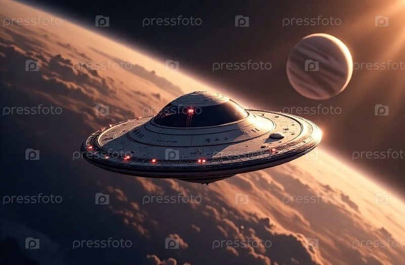 Неопознанный летающий объект в форме тарелки космический корабль летающий в космосе. Генеративный искусственный интеллект