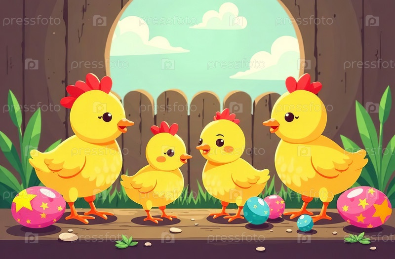 Куры и красочные пасхальные яйца в курятнике. Генеративный искусственный интеллект