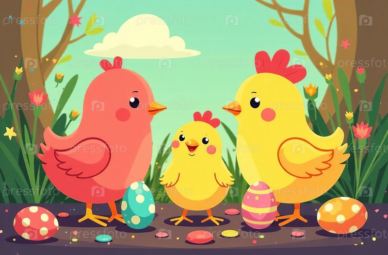 Куры и красочные пасхальные яйца на зеленом лугу. Генеративный искусственный интеллект
