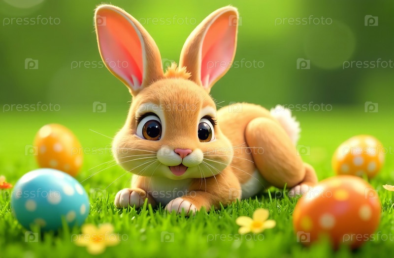 Пасхальный кролик и разноцветные украшенные яйца на зеленой луговой открытке. Генеративный искусственный интеллект