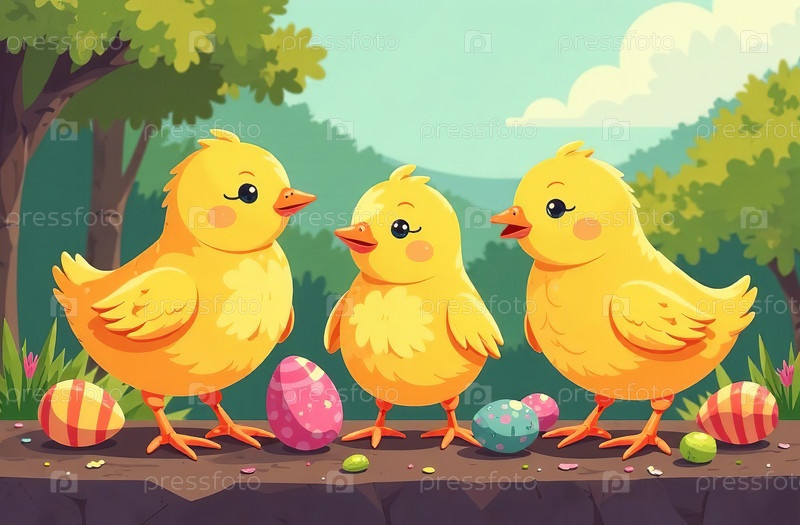 Куры и красочные пасхальные яйца на зеленом лугу. Генеративный искусственный интеллект