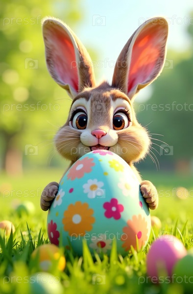 Пасхальный кролик и разноцветные украшенные яйца на зеленой луговой открытке. Генеративный искусственный интеллект