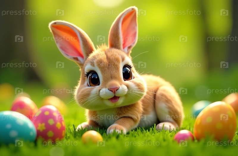 Пасхальный кролик и разноцветные украшенные яйца на зеленой луговой открытке. Генеративный искусственный интеллект