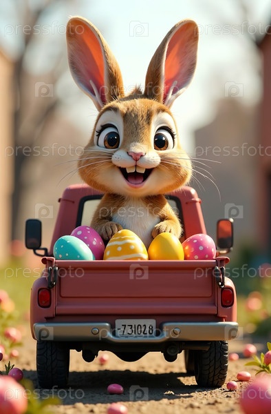 Пасхальный кролик и разноцветные яйца в багажнике пикапа. Генеративный ИИ
