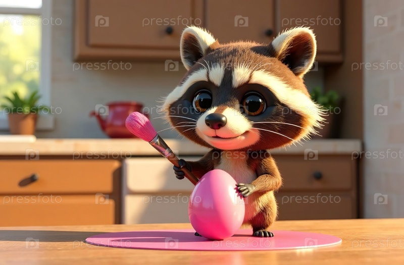 Енот красит яйцо в розовый цвет на кухне, пасхальная открытка. Генеративный искусственный интеллект