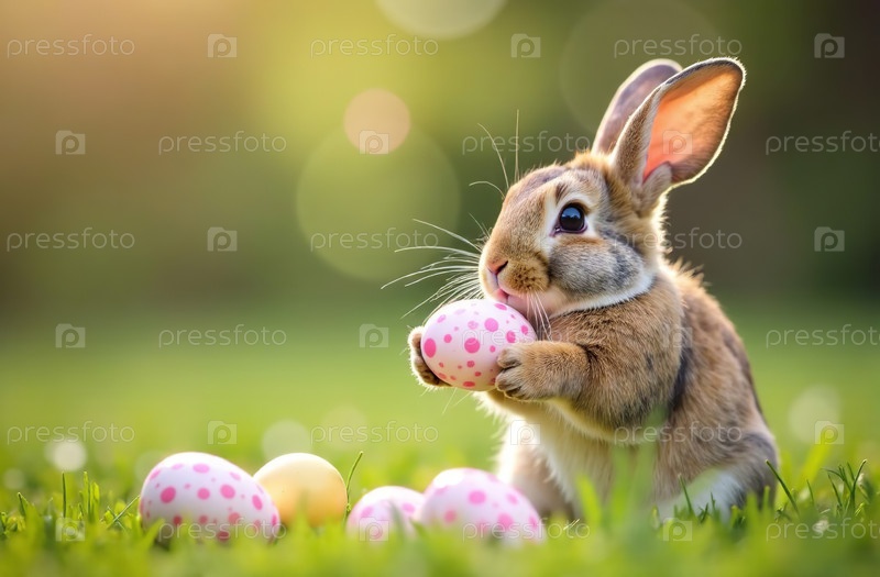 Пасхальный кролик и разноцветные украшенные яйца на зеленой луговой открытке. Генеративный искусственный интеллект