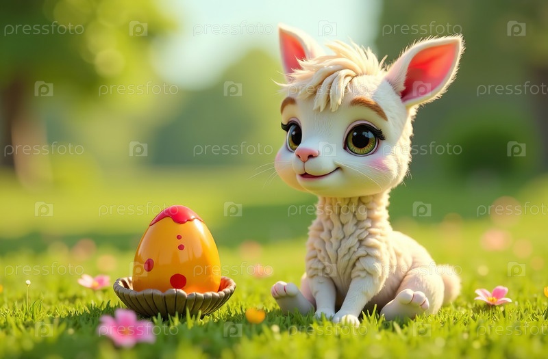 Маленькая лама среди цветных традиционных пасхальных яиц на зеленом лугу. Генеративный искусственный интеллект