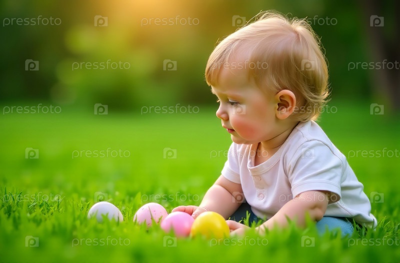 Младенец и цветные традиционные яйца на зеленом лугу, пасхальная открытка. Генеративный искусственный интеллект