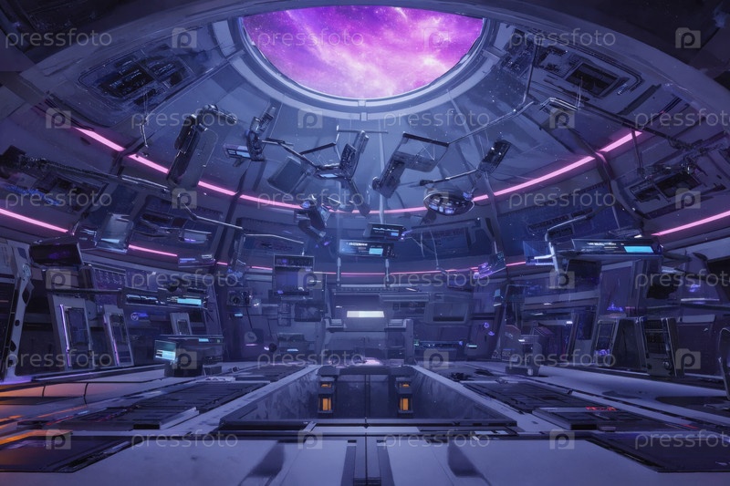 Интерьер космического корабля, космос и планеты в окне. Генеративный ИИ