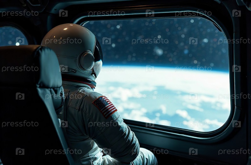 Скафандр и шлем астронавта в космическом корабле, вид из окна. Генеративный искусственный интеллект