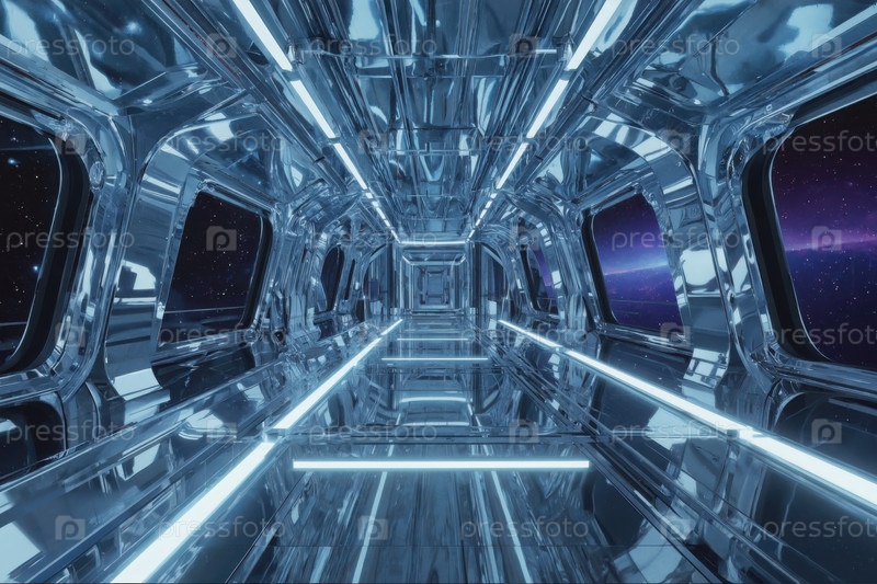 Интерьер космического корабля, космос и планеты в окне. Генеративный ИИ