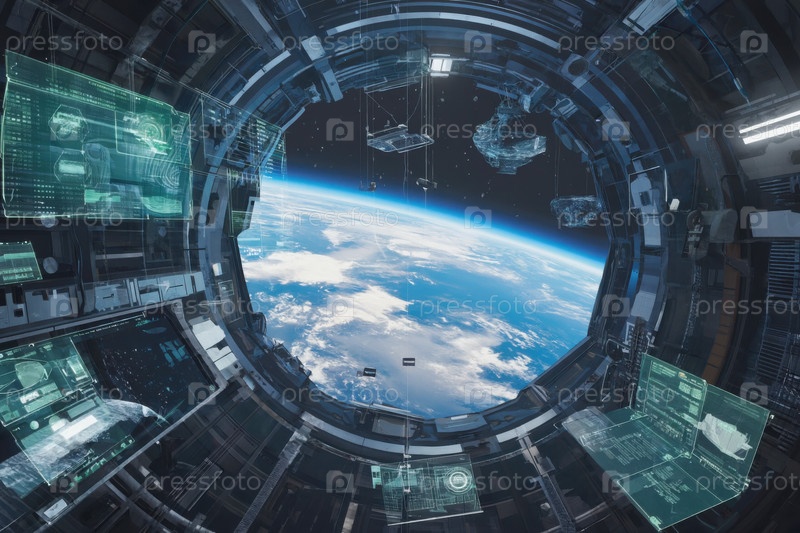 Интерьер космического корабля, космос и планеты в окне. Генеративный ИИ