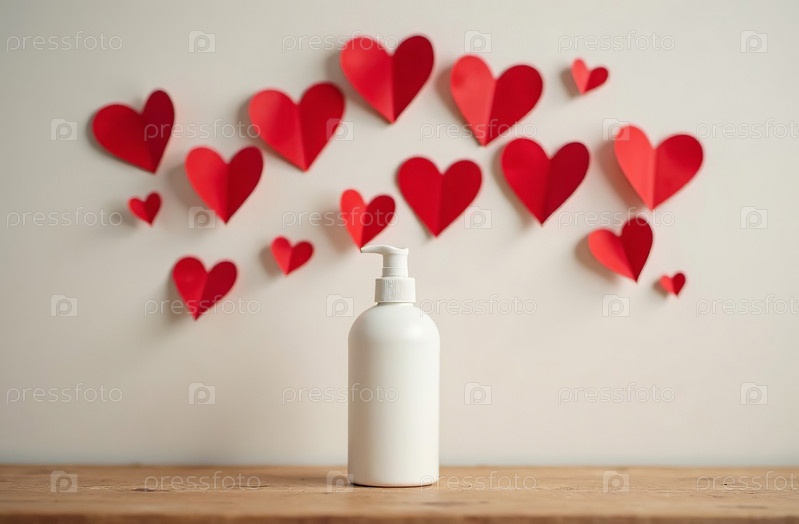 Макет Белая тюбик Бутылка Косметическая банка фон красные бумажные сердечки. Генеративный искусственный интеллект
