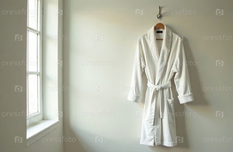 Белый хлопковый халат повесить вешалку светлая ванная комната, светлый интерьер. Генеративный искусственный интеллект