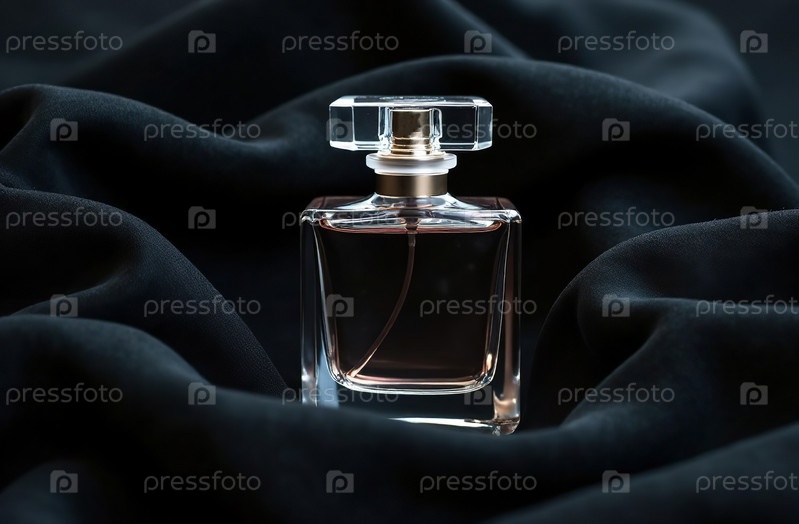 Макет прозрачной стеклянной упаковки для духов в черной ткани. Генеративный искусственный интеллект
