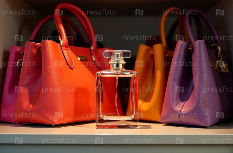 Макет прозрачной стеклянной упаковки для флаконов духов с женскими сумками. Генеративный искусственный интеллект