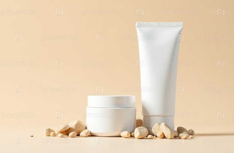 Макет белой тюбиковой косметической баночки на бежевом фоне. Генеративный искусственный интеллект