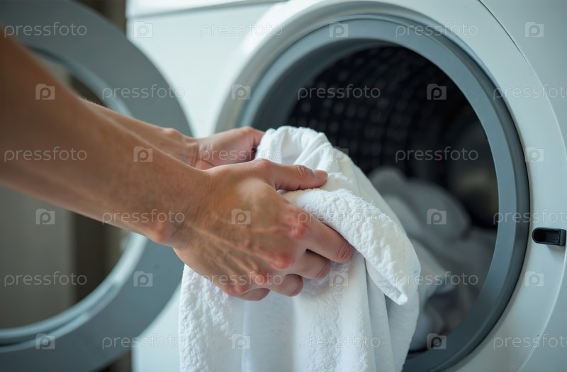 Женщина кладет одежду в стиральную машину, стирает одежду в прачечной. Генеративный искусственный интеллект