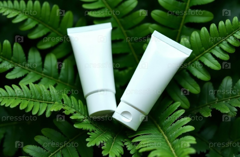 Макет белой тюбиковой бутылки косметической банки на фоне зеленых листьев. Генеративный искусственный интеллект