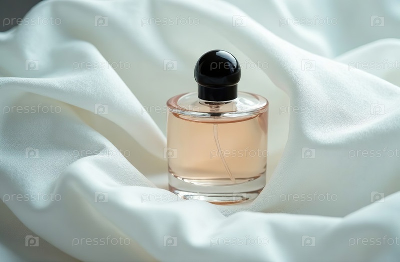 Макет прозрачной стеклянной упаковки для духов в белой ткани. Генеративный искусственный интеллект
