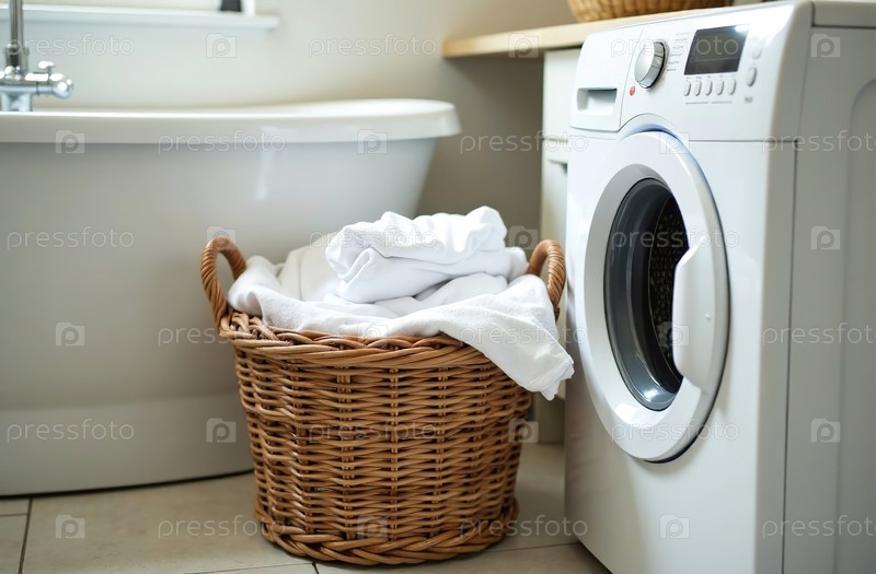 Корзина для белья в прачечной, стиральная машина в светлой ванной комнате. Генеративный искусственный интеллект