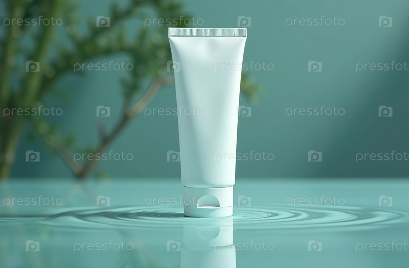 Макет белой тюбиковой бутылки с косметической баночкой в воде на синем фоне. Генеративный искусственный интеллект