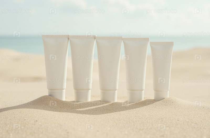 Макет белой тюбиковой бутылки косметической банки на песке пляжа. Генеративный искусственный интеллект