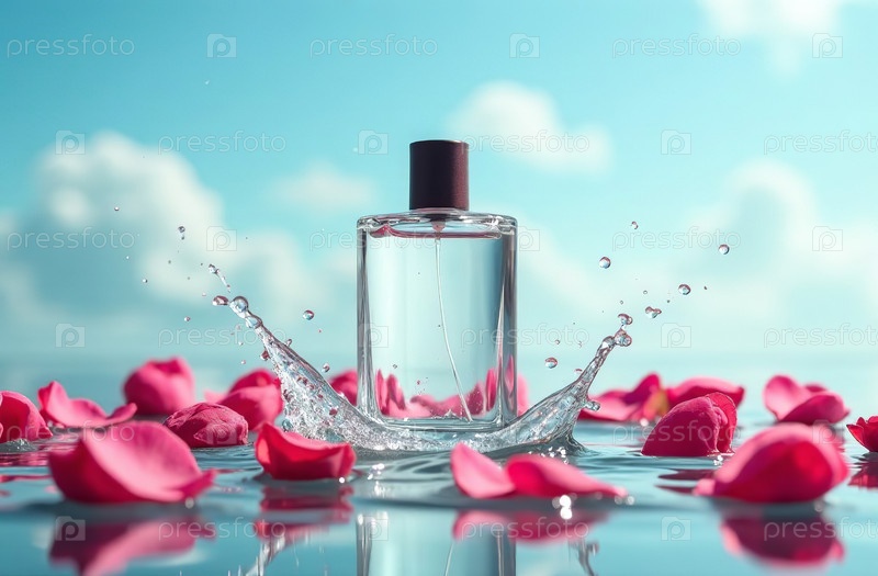 Макет прозрачной стеклянной упаковки для духов с лепестками роз в воде. Генеративный искусственный интеллект