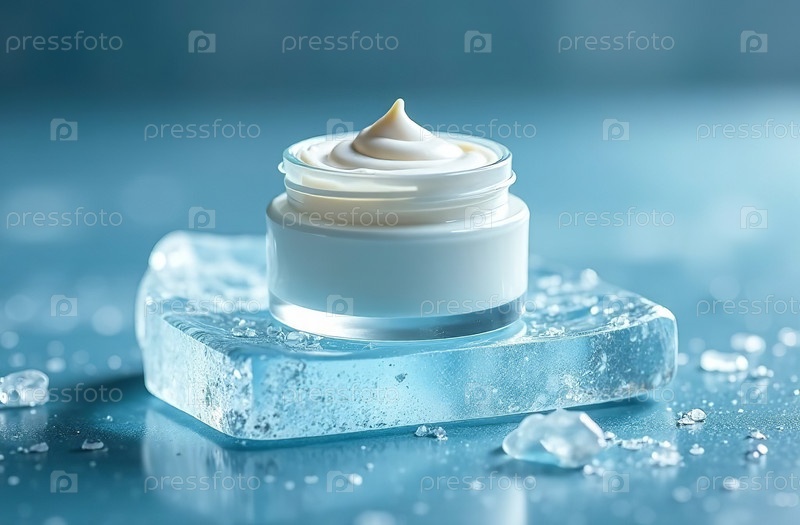Макет белой тюбиковой баночки для косметики в кусочках льда. Генеративный искусственный интеллект