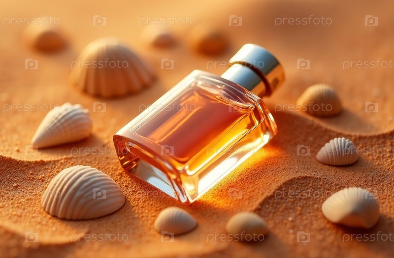 Макет Прозрачная стеклянная упаковка Флакон духов фон ракушка пляж AI Генеративный