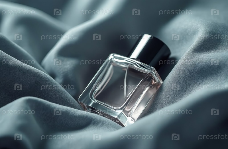 Макет прозрачной стеклянной упаковки для духов в серой ткани. Генеративный искусственный интеллект