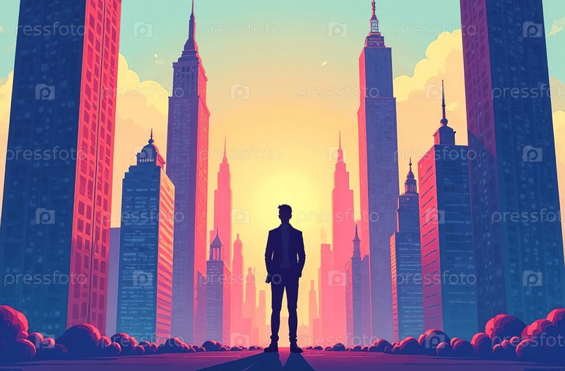 Человек на фоне Футуризм кибергород, панорама виртуальная реальность. Генеративный ИИ