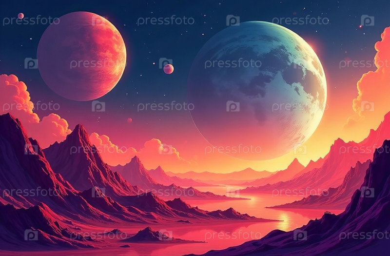 Ландшафт планета большой спутник ретро футуризм гора панорама. Генеративный ИИ