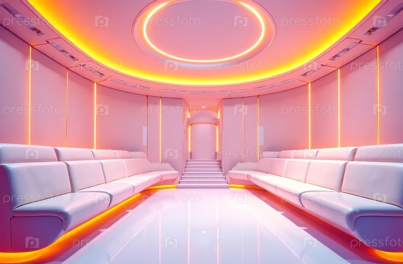 Ретрофутуризм интерьера здания, свободное пространство гостиной. Генеративный искусственный интеллект