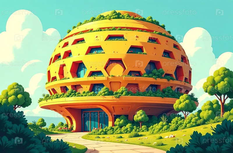 Ретро-футуризм, научная фантастика, городская панорама, экстерьер здания. Генеративный искусственный интеллект
